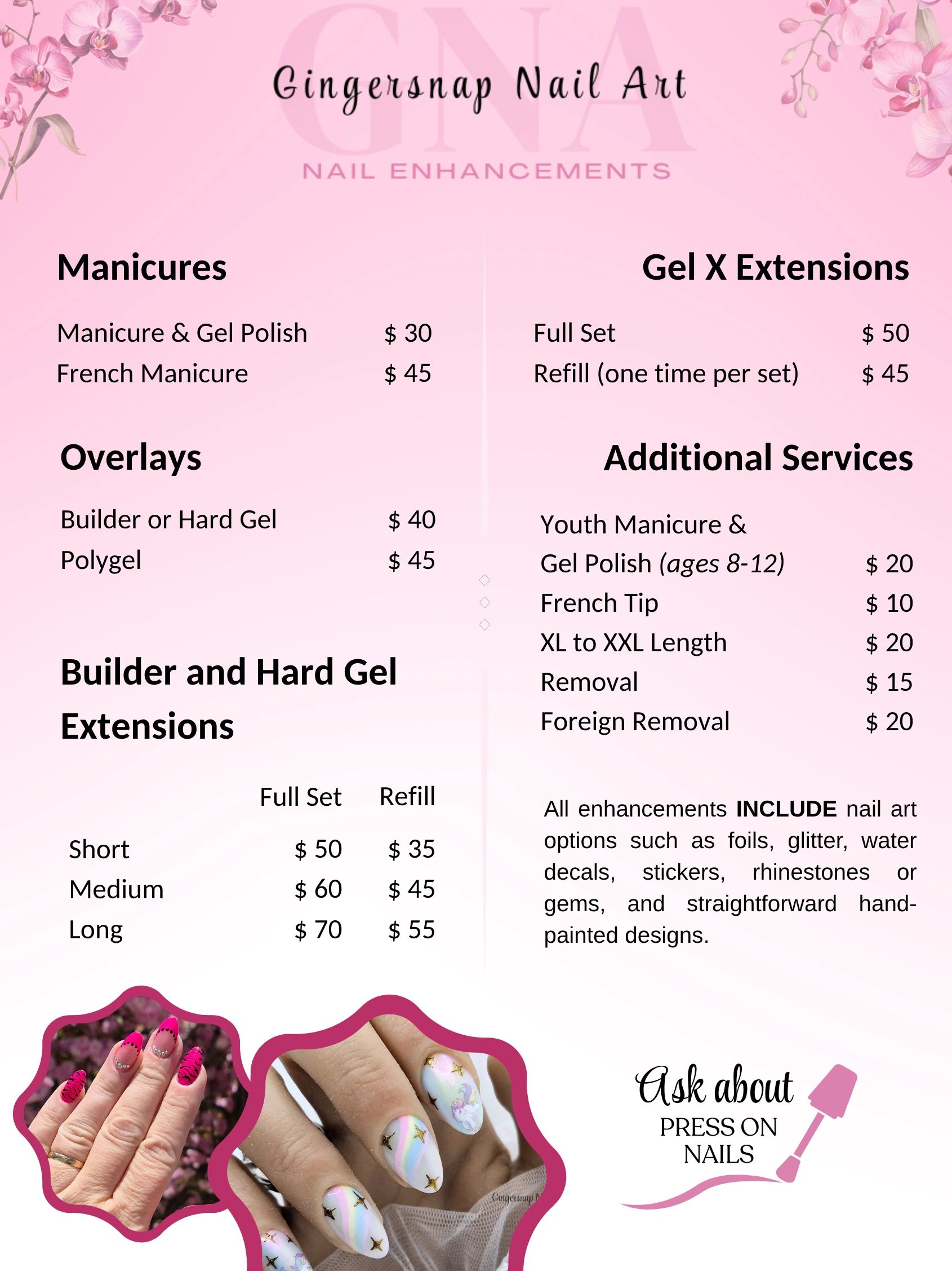 Take your nails to the next level with custom designs created by our talented nail artists. From minimalist accents to intricate patterns, your nails will be uniquely yours.